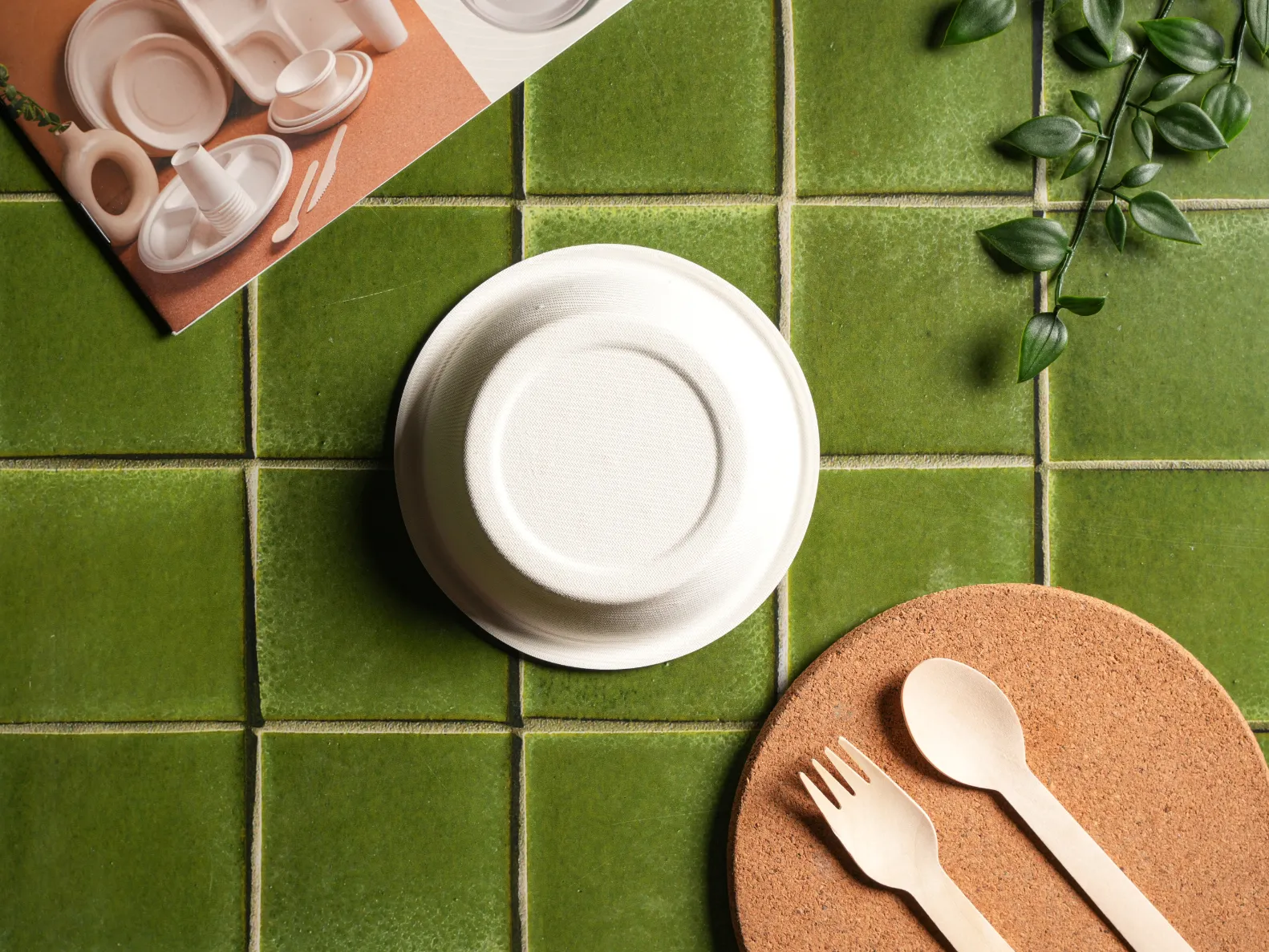 Sugarcane bagasse, bamboo fiber, and other compostable components.